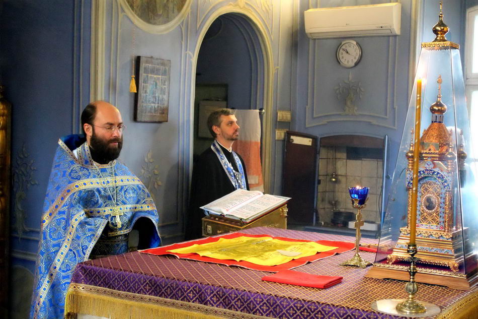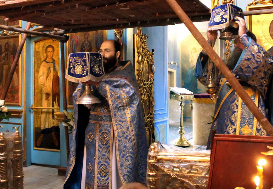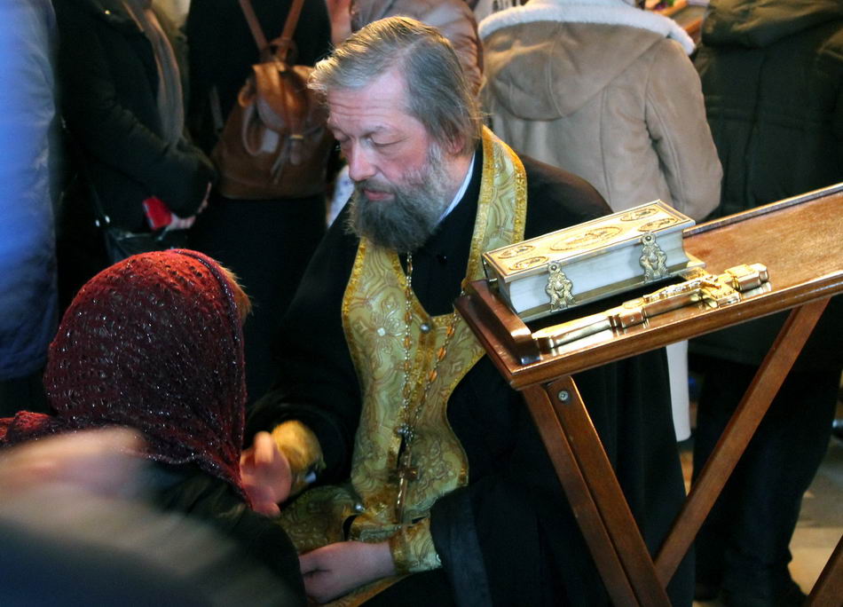 После причастия настоятель совершил славление у иконы Благовещения Пресвятой Богородицы и мощевика с частицей мощей святителя Тихона.