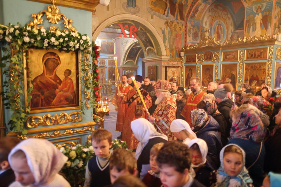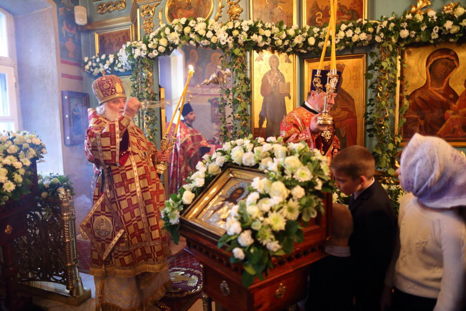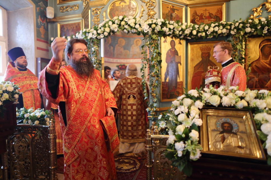 Владыка Арсений приветствовал отца благочинного, настоятеля, сослужащее духовенство и молящихся с престольным праздником храма.