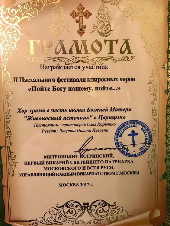 По благословению настоятеля храма 7 мая приходской хор под управлением П. Л. Лавриной принял участие в Пасхальном фестивале приходских хоров проходящим в храме Покрова Пресвятой Богородицы в Орехово-Борисово Южное.