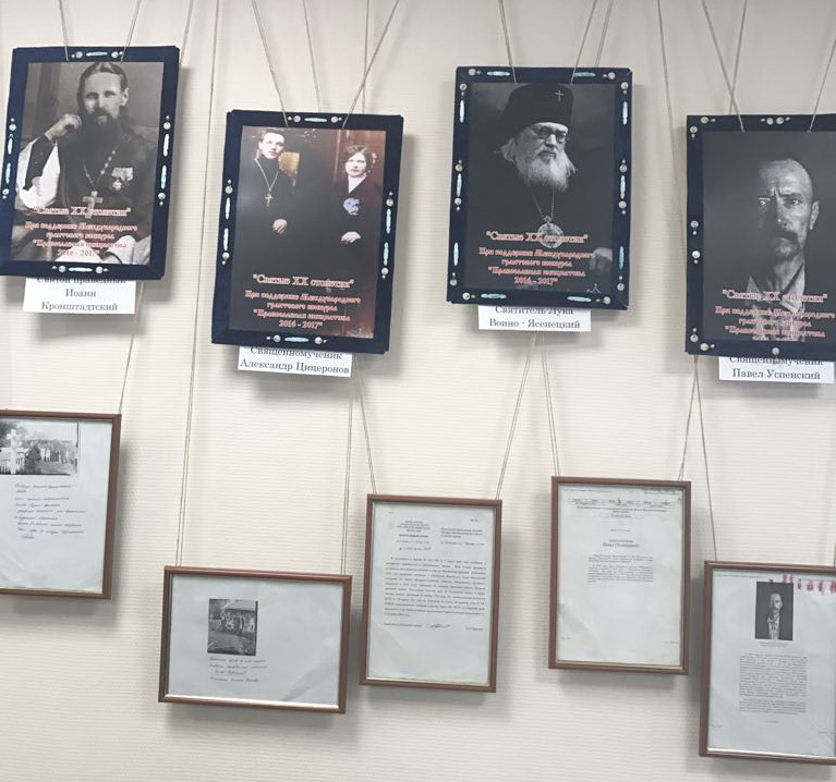Выставка поделена на несколько разделов каждый из которых рассказывает про святых так или иначе связанных с нашим храмом: святой праведный Иоанн Кронштадский несколько раз был восприемником и принимал участие в Таинстве Крещения в Царицыно, святые священномученики Александр Цицеронов и Павел Успенский служили в храме, а святитель Лука Войно-Ясенецкий является молитвенным заступником нашей больничной часовни, из которой специально к открытию выставки в Гимназию была принесена икона с частицей его святых мощей.