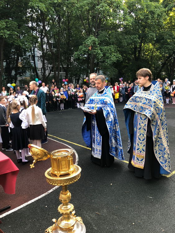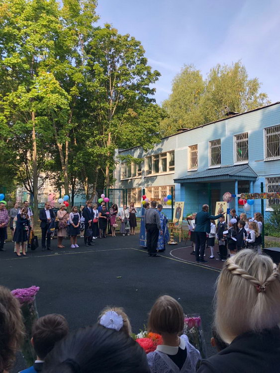 После теплых, напутственных слов отца Олега и директора школы Ирины Михайловны Гавриловой учащиеся, их родители, педагоги и гости школы стали участниками торжественной линейки.