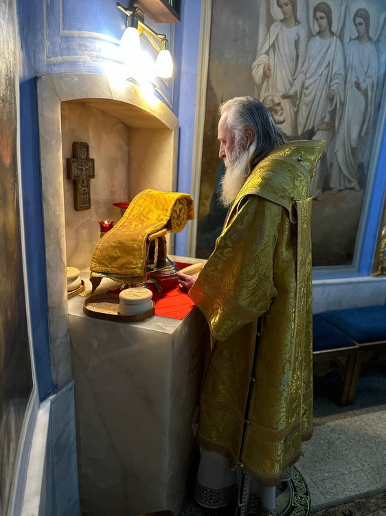 На малом входе во исполнение благословения Святейшего Отца клирик храма протоиерей Александр Лаврин был награжден правом служения Литургии с открытыми Царскими вратами до «Херувимской песни…».