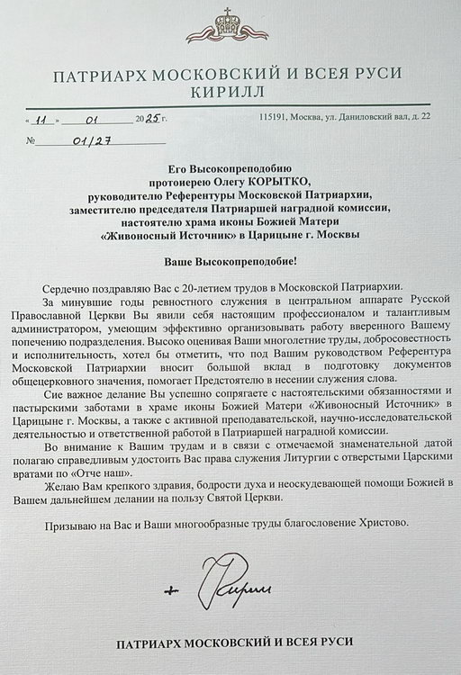 20-летие настоятеля в Патриархии